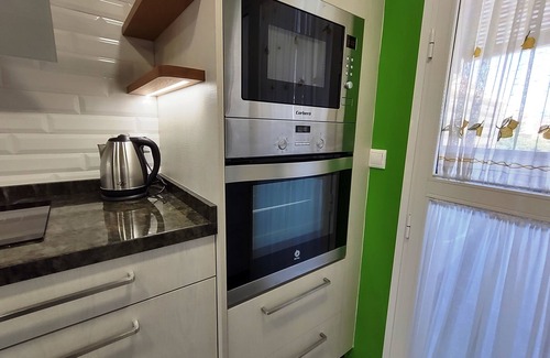 Kitchen equipped with ceramic hob, fridge with large capacity freezer, dishwasher, oven, microwave, coffee maker, kettle, blender, toaster and kitchenware.