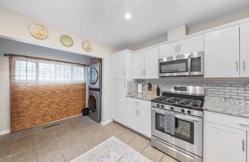 This home boasts two large bedrooms and two full bathrooms, free parking and a large, fenced, back yard w. a fire pit and grill available for your use. BYO supplies for grill and fire pit to make the most of your stay. The master suite features a lush queen size bed, Roku TV, ceiling fan, and a large walk in closet with hangers and a large dresser for your clothes to stay organized during your stay. The master suite bathroom boasts a clean and huge soaker tub with separate shower, double sink vanity, and of course a toilet. The home features a spacious and cozy living and dinning room, a full size washer, dryer, refrigerator, gas range and oven, sink, microwave and dishwasher. The living room includes a sleeper sofa for two and the dinning room can accommodate up to 6 guests at one time for large families. Free parking for up to 4 cars are welcome on our spacious driveway. Please note our home is a split level home and there are steps to come inside, go to the bedrooms, and to go into the back yard. The home is not wheelchair accessible.
