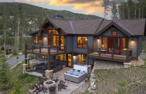 This glamourous yet cozy mountain-modern estate checks every box. Inside, outside, and around every corner is something to do or enjoy. This luxury estates could be your entire vacation! about 1200 feet (as the crow flies) to Main Street, or a mile drive to town, you are right where you want to be. This sprawling, and perfectly laid out home offers 5 luxury en-suite bedrooms each with their own bathroom, 2 gathering areas, Five (yes 5) balconies/patios, and unique designer finishes everywhere you look. Cook up a storm in the well stocked, gourmet, chef's kitchen with Wolf / Sub-Zero appliances that open to a massive main level gathering area. Ample dining / bar seating, a modern stone fireplace, Flat Screen with Sonos surround draw gatherings to this cozy yet expansive living area. Gaze out the large glass to the large, modern, entertaining deck that overlooks the first three Peaks of the 10-mile range. Meander downstairs to the opulent family room marked by more cozy seating, another large stone fireplace with flat screen and Sonos surround. Shoot pool while having drinks at the gorgeous wet bar while others wander out back to the enormous mountain-facing outdoor gathering space. Once outside, you get to toggle between an ultra-high-end hot tub and the large circular gas fire-pit. Sit by the fire, or around the covered 300 sq feet lounge area with your favorite glass of wine while the sun wanes over the distant peaks.