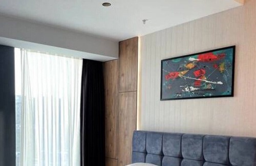 The apartment features 5-star amenities including: AC, WIFI, a dishwasher, an electric kettle, a microwave, a water dispenser, a Smart TV, and ceiling-high windows.