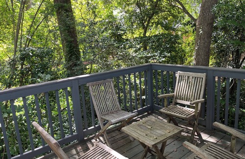 Escape to this delightful carriage house in a Historic area of Buckhead. The guest house is complete with a full size kitchen plus laundry facilities. Despite being within the city limits, you will feel like you're in your own private forest while enjoying coffee on your private deck. The two-story house has a gorgeous solid mahogany bed upstairs and a American Leather Sofa downstairs with a pull out queen bed that is actually comfortable (it's made from memory foam so there aren't those uncomfortable springs with a bar poking you in the back). There is also an ultra comfortable leather recliner and a useful office/working space.