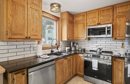 The fully equipped kitchen features everything you need to prepare delicious meals, with essential appliances at your disposal. Dine together at the large dining table, or take your meals outside to the private patio with a fire pit and gas grill, where you can soak in the breathtaking views of Mt. Abrams and the surrounding mountains.