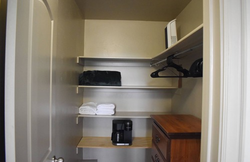 Mini-fridge, microwave, coffee maker, and basic dining essentials for light meals