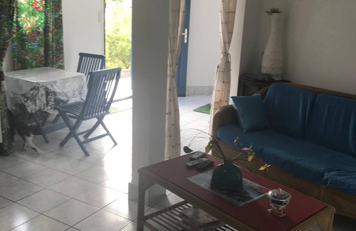 bottom of villa (50m2 approximately) overlooking a garden with trees and flowers located halfway between north and south of Martinique, 5 minutes from the airport, 20 minutes from the nearest beaches by the toll free highway. Quiet