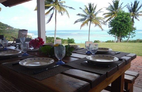 Living room and dining room on terrace facing the sea. Lounge bar and poolside terrace with carbet
