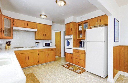 This classically decorated home features an inviting and large floor plan with charming decor, gorgeous hardwood floors, and abundant natural light. In the main living area, a comfy couch and two armchairs are set before a 50-inch Roku TV. An adjoining den provides even more social space with an office nook and a poker table for six. The modern kitchen features beautifully stained wood cabinetry, dual sinks, a tiled backsplash, and a full suite of appliances. Helpful gadgets include a blender, toaster, and coffee maker.