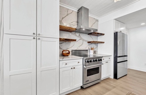 Guests will enjoy a semi-private elevator entrance that leads into a sophisticated foyer, an open living room with plush seating and a flat-screen TV, and a fully equipped kitchen with stainless steel appliances. The dining area comfortably seats six, with an additional four bar stools at the kitchen counter.
