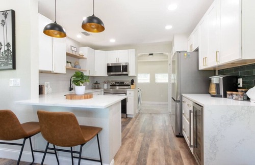 This fully renovated home features two bedrooms (both queen beds), one bathroom, heated pool, full kitchen, and laundry. The home has a beautiful backyard oasis for guests to relax and enjoy the Florida sun. There is outdoor dining/lounge seating and a bbq grill.