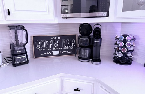 This Gourmet kitchen features granite counter-tops, stainless steel appliances, beautiful custom cabinetry, a Keurig coffee maker, toaster and tea kettle. It's fully stocked with utensils, cutlery and everything you need to prepare and serve meals.