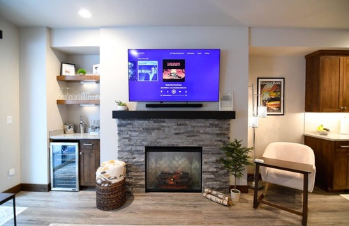Pull into the ground floor 2-car garage, with an extra space in the driveway. Up the first flight of stairs is the living room with a gas fireplace and a refrigerated mini bar. Cozy up on the new sectional sofa with 3 recliners and watch a movie on the 70 inch smart television with sound bar. Step onto the tree lined balcony for a fresh breath of air. The open kitchen/dining area has high end appliances and is stocked with every amenity you need. Just off the kitchen is a small "nook space" with a full size murphy bed, arcade table, smart tv and half bath. Go upstairs to find the laundry room, and 2 beautifully decorated king sized bedrooms with ensuite baths, both equipped with smart TVs and cozy bedding. Each has a large closet to store your belongings and ceiling fans to circulate the air. The townhome is equipped with both heating and air conditioning.