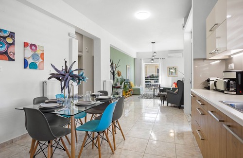 Our home consists of a spacious modern open plan living area designed for relaxing in front of the large flatscreen smart TV , playing a game or maybe reading your book . This area opens onto the beautiful outdoor area with table and comfortable chairs where you may enjoy your breakfast in the morning or the starlight in the evening. All rooms have separately controlled Air conditioning and high speed WiFi . Free on site designated parking is available with additional street parking.The bedrooms are equipped with luxury quality mattresses as well as exquisite bedding, designed in a clean modern yet romantic atmosphere. Our sheets and pillow cases are 100% fine COTTON. The master bedroom has a luxurious double bed and the other, two single beds that can be brought together with a built in system to make another double bed. A comfy sofa in the living room is available for a child to sleep. Our modern kitchen is equipped with built in washing machine, oven, microwave oven and refrigerator. All cupboards have soft close mechanism for absolute quiet.You can also enjoy Nespresso coffee machine, coffee maker , kettle , toaster and panini press ,breakfast will be ready in no time!