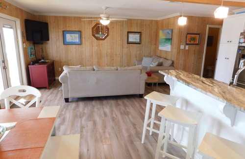 This 2 bedroom/2 bath Gulf View Home has been newly remodeled in 2016 steps away from sugar white sand and crystal clear water. Sleeps 8 with large shaded porch and sun deck with plenty of room for family gatherings. 150 foot walk to the whitest sand in the area. Fantastic views of Gulf from the front porch and Mobile Bay from your private sundeck! Shower off with outside shower or totally remodeled bathrooms upstairs. There is a BBQ/Picnic Area downstairs with more shaded areas under the house. A short walk to the bay side (accross Hwy 180) has an inlet perfect for launching Kayaks and excellent fishing on the Gulf or Bay side of the peninsula. 50' Flat Screen TV mounted on wall in Living Area and 32' Flat Screen TV in Bedroom #1. Living Area and Breakfast areas both face Gulf of Mexico! Shopping and Restaurants are only minutes away.