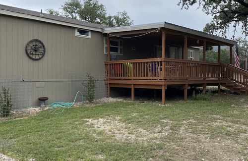 House with Frio river access. Relax on the large front porch, use the wood BBQ or just sit by the fire pit and star gaze. New swing set for the kids and now a cowboy pool for the family. Walk on down to the Frio river and cool off in the clear water. Ready for bed, we have two bedrooms with queen beds and quality bedding. Also queen sofa sleeper in the living area. The kitchen is fully stocked with anything you need for those gourmet meal or simple country breakfasts. Two full baths will keep everyone comfortable.