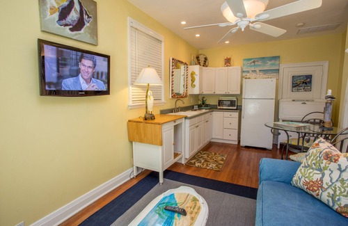 We are directly across the street from the beautiful and pristine Gulf of Mexico in a quiet neighborhood on North Clearwater Beach. The property is tastefully decorated and well appointed with everything you need for a relaxing respite from your busy life. You will enter through a brick courtyard, where your door opens to a living room and dining area. The kitchen comes fully equipped. The cottage includes a spacious bedroom with a king size bed, a flat screen TV, and WIFI. We have a gas grill, beach chairs, and a washer and dryer available for your use. Outside area includes a separate dining and siting areas for your enjoyment.
