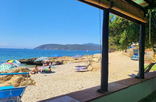 Independent cottage on the sandy shore of Gli Stecchi, composed of sea view patio, entrance with large closet, bathroom with shower, large room with kitchenette, area with sofa bed 2 places, bedroom area; outside additional space for exclusive use with small kitchen area and sink. Maximum beds: 4. Pets not allowed. The house has private parking space; because of its wonderful location ON THE BEACH it is obviously not accessible by car. The car is left in the parking space and suitcases are carried on foot along the path to the sea (distance about 150 mt).