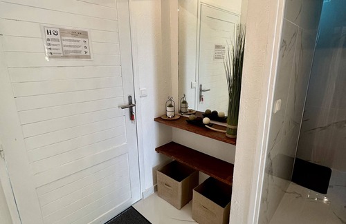 Vous y retrouverez un four micro-ondes, une plaque de cuisson, un réfrigérateur, deux cafetières (une Nespresso et une traditionnelle), une bouilloire, un grille-pain, un sèche cheveux, un fer à repasser, une petite table à repasser etc…