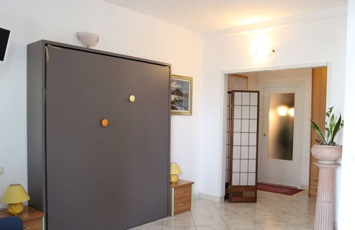 ground floor apartment, with separate entrance, fenced, living room with kitchenette, sleeping area with foldaway bed and any closable bed or cot added, bathroom with shower, TV, washing machine, air conditioning, free wi-fi, outdoor porch equipped with table and garden chairs and rocking, parking, 350 meters from the sea.