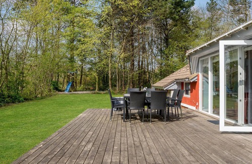Centrally located vacation home with a pool area that invites you to hours of fun and relaxation with the pool, jacuzzi and sauna. The house is perfect for the large family. It is functionally furnished and has a well-equipped kitchen. The spacious living room is nicely furnished, from here you can also access the terrace facing south. In the house, in addition to the bathroom, there is also a guest toilet. On the property there is a trampoline and other playground equipment for your children. About 3 minutes walk it is to a center where you will find a bouncy castle, tennis court, stores and a cafeteria. There is also a large fishing lake and several golf courses nearby. The beautiful nature of the surrounding area can also be well explored by walking and cycling. Included in the rent is the entrance to the Badeland and bowling in Varde.