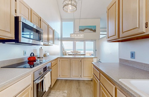 Inside the home, you'll immediately notice the high vaulted ceilings in the spacious living area decorated with lovely paintings, a bright chandelier overhead, and comfortable furnishings. Step out into the back and sit down on the sectional couch and lay your head down on one of its crimson pillows for a power nap. The beach is within walking distance, where you can hear the sound of the waves crashing in peacefulness. Use the full kitchen and its stainless steel appliances for an all-out dinner later in the evening! The electric fireplace will add ambience with a gorgeous view directly from the comfort of your chairs near the windows. You'll also have on-site activities to participate in, such as tennis courts, bocce ball, pickleball, pool, spa, and volleyball court.