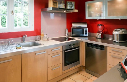 The open kitchen is well-equipped with an oven, dishwasher, three ceramic glass hob hotplates, toaster, kettle, microwave, freezer, and an electric coffee machine. The house also offers a shower/WC area and electric heating. Outside, there are two terraces with terrace furniture, a portable barbecue, four deck chairs, and a box-room. Additional facilities include a washing machine, iron, children's high chair, baby cot, and free WiFi internet access.