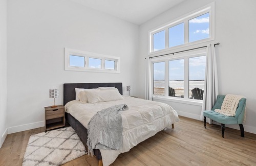The home features a large primary suite with king bed, walk in closet, ensuite bath and amazing views of the water. The secondary suite has a queen bed, a workspace and the same stunning view of the water. The bunk room is perfect for the kiddos, with a bunk bed that is two double beds with one single trundle bed underneath, a large chair and massive bean bag for hanging out. The well-appointed bathrooms include sleek fixtures and all the essentials.