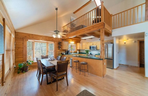 The cabin is airy and light, with many amenities to make your stay memorable! The lot is surrounded by tall ponderosa pines, oak, and juniper trees. It is lush and green in the summer, yellow and orange in the fall, and opens up the views in the winter when the leaves are gone.