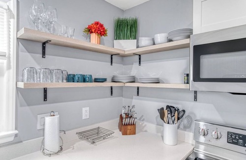 Make your way into our clean, newly renovated kitchen where you will find all the amenities from home. Complimentary wine will be left for all of our guests. Coffee makers, pots and pans, cutlery, plates, cups, and more are available for all your cooking needs! The washer and Dryer are located in a small nook next to the kitchen.