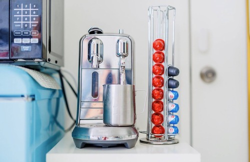 Enjoy a cup of perfect Nespresso latte, the kitchenette has the essentials: toaster, microwave and a retro mini fridge.
