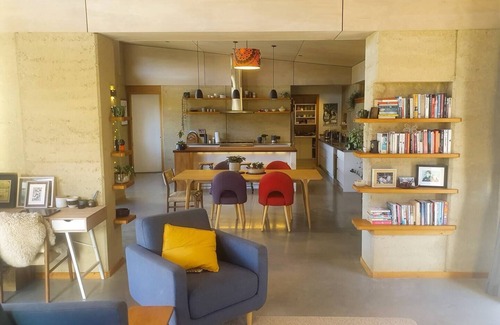 Kick back and relax in this calm, stylish space. This rammed earth house is situated on an acre section at the end of a private lane making it a peaceful getaway with plenty of space for the whole family. There are three bedrooms with double/queen beds, two bathrooms and a seperate lounge which has the option of two rollaway beds for additional sleeping space. The main living is open plan kitchen/dining/lounge with a log burner.