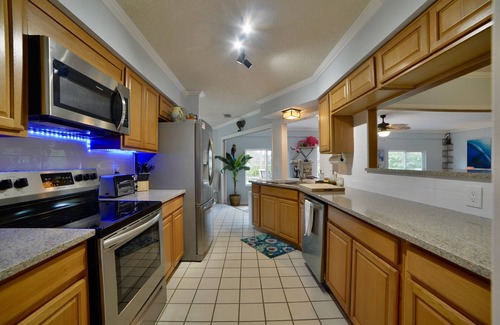 As you pass through into the enclosed, under-air Florida room you can enjoy a functional coffee bar with all the amenities and goodies you need for your morning brew. The glass slider opens up to your own private backyard, which includes various seating areas and a gas grill for all your barbecuing needs. Depending on your time of visit you may find fruit in season. Feel free to pick and enjoy bananas, avocado, papaya, calamondin, lemon, loquat, and mango.
