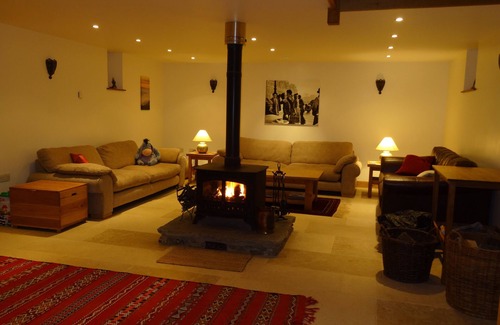 Large open sitting room with wood burner (multi fuel), TV, DVD and comfortable seating.