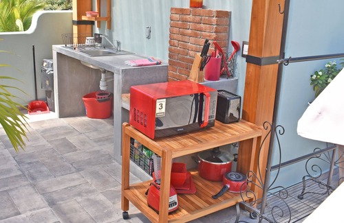 La suite cuenta con servicios de lujo: una comodisima cama queen size, aire acondicionado, pantalla de 40’’con SKY, WiFi y baño privado. Se encuentra en un sector tranquilo y seguro de Huatulco, a pocas cuadras de la Bahía de Santa Cruz y además colinda con el Parque Nacional. Elementos distintivos son: una cocina al aire libre con asador, un amplio patio, una zona de bar/asador y un alberca con jacuzzi. El inmueble fue recién construido y se compone solamente de dos suites independientes.