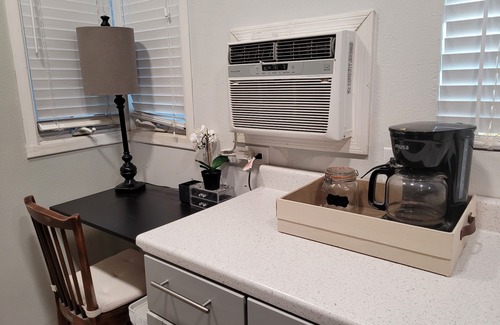 This cozy suite has everything you need for a comfortable stay, including a retro-inspired red refrigerator, apartment-size stove, microwave, flat-screen TV, love seat, desk, and more. Perfect for solo travelers, couples, or business trips.