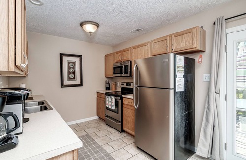 The kitchen table is seats 6 adults comfortably, but you can easily squeeze more kids onto the bench seating. The kitchen itself is fully stocked with all the utensils and appliances needed to prepare home-cooked meals. We provide Keurig and drip coffee makers, coffee, creamer, and sweeteners.