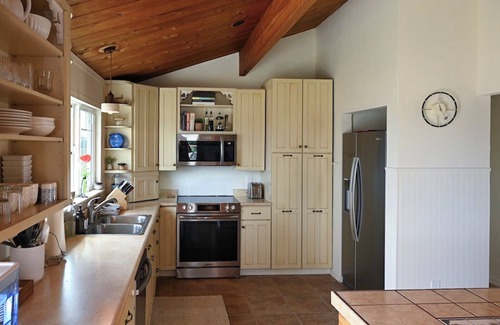 Inside, vaulted ceilings and natural light create an inviting space to relax. At the heart of the living room is a propane fireplace, offering a cozy, romantic alternative to screen time (though a 65" TV is there when you want it). The fully updated kitchen features new appliances and a large island, perfect for cooking meals, enjoying a casual breakfast, or sharing local wine in the evening. A game cabinet, bookcase, and coffee/wine bar add to the simple pleasures that make time indoors special.