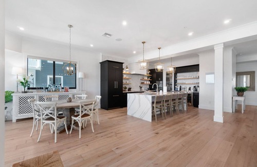 After a gorgeous day at the beach—or if you decide to skip the beach altogether—unwind with a glass of wine on the elevated deck around the cozy firepit. It's the perfect spot to soak in the serene atmosphere and admire the views. When it's time for lunch or dinner, fire up the gas grill at the poolside summer kitchen and enjoy a classic backyard family barbecue. The massive, heated pool and hot tub are perfect afternoon delight or evening family event.