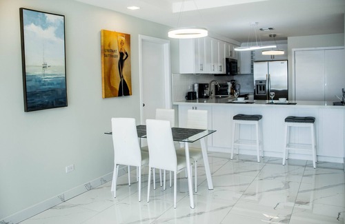 -Fully Equipped Kitchen: High-end stainless steel appliances, granite countertops, ample storage, a breakfast bar, and an indoor dining table for eight. Outdoor dining for five on the balcony.
