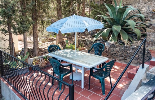 Outside: Terrace with outdoor furniture: table and chairs, and views of the area.