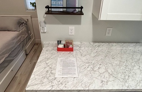 Renovated mother-in-law suite with private smart-keyed entrance, hot shower, kitchenette, and a comfy queen sized bed.