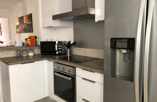 A kitchen open to the fully equipped living room including an American fridge with fresh water and ice dispenser, crushed ice, an oven, a microwave, dishwasher, washing machine, Nespresso machine, ceramic hob, all kitchen utensils and dishes ...