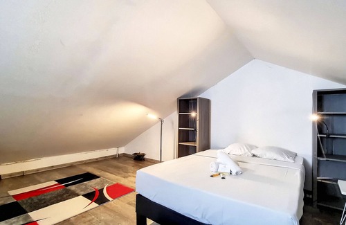 ✅Une mezzanine room, air-conditioned, equipped with a double bed with quality bedding and a TV corner