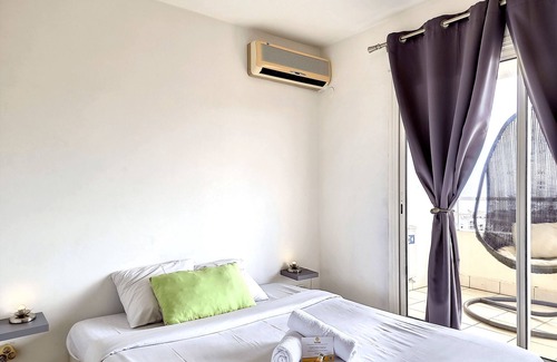✅ An air-conditioned bedroom equipped with a Queen Size bed, a closet and an opening onto the terrace.