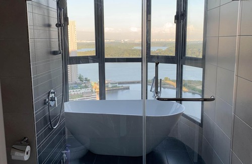 Teega Residence at Puteri Harbour,20+floor with sea and pool view. Premium stack with North and east facing unit. All 3 bedrooms come with attached bathrooms. Luxury furniture, Digital smart door for ease of check in and security, Fully furnished with brand new appliances (55” smart TV, huge fridge, washing machine, microwave, cooking utensils, ironing, hair dryer), free wifi, bath tub, rain shower and bath amenities).