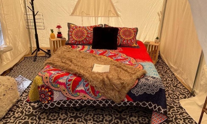 Your Tentrr campsite includes a 10'x12' (120 square feet) safari-style canvas tent on a raised wooden platform. Inside the tent you'll find one queen bed with a memory foam mattress. The tent is big enough for the bed plus one or two extra sleeping bags on the floor. Aside from the canvas tent, campers can also use the extra 5-person pop-up dome tent that’s provided. You'll also have a 6-ft picnic table, outdoor fire pit, 2 Tentrr Adirondack chairs, and a heating source to keep you warm and toasty at night.