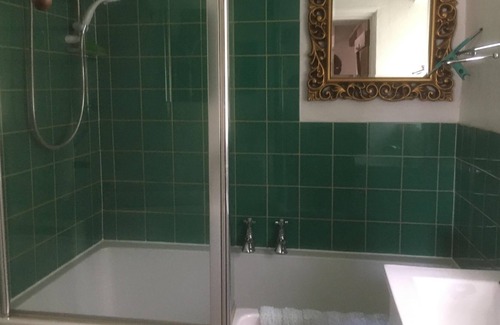 The downstairs bathroom features an "L" shaped bath with electric shower and a separate toilet enclosure.