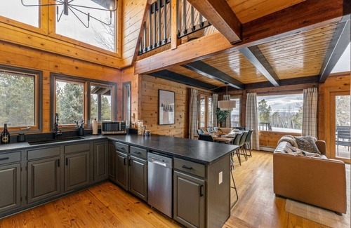 The cabin was renovated in 2024 and features two completely new bathrooms and an updated kitchen with brand-new appliances and washer/dryer. Vaulted ceilings and a wall of windows provide ample natural light and amazing views of the 4.5 private acres of land. The extra-large loft includes a game nook with amenities to keep everyone entertained including a record player, board games, Roku TV with Nintendo, and a telescope to observe the beautiful night sky.