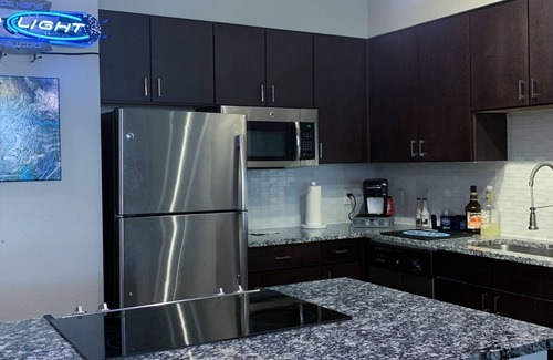 The unit is spacious at over 750 sq ft. It is also very modern and simple. The walls are filled with huge abstract canvas art and bar like decor. A neon sign, a bar mat, corona salt and pepper shakers, and much more. All appliances are stainless steel and the countertops are all granite. This is a luxury modern apartment filled with all the necessities to make your stay comfortable and instagramable. There is also a nice foozeball table for entertainment.