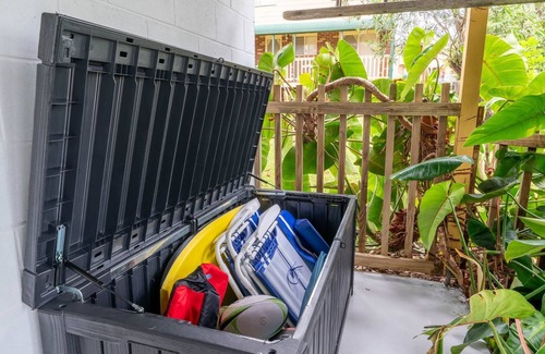 A generous deck awaits upstairs, providing breathtaking views of the beach and Green Island.
