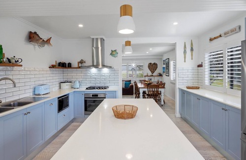 There’s space for everyone in this beautifully renovated beach house. Enjoy a morning cuppa in the sunshine on the main deck, listening to the birds and the ocean. Or sundowners on the lower deck, leading out from the family fun room (a former boatshed) which has a full size pool table, darts, games and a bar. It looks out over a large grassy lawn that’s perfect for backyard cricket or bocce.