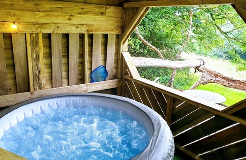The hot tub is located in a secluded, covered woodland spa area, overlooking meadows.